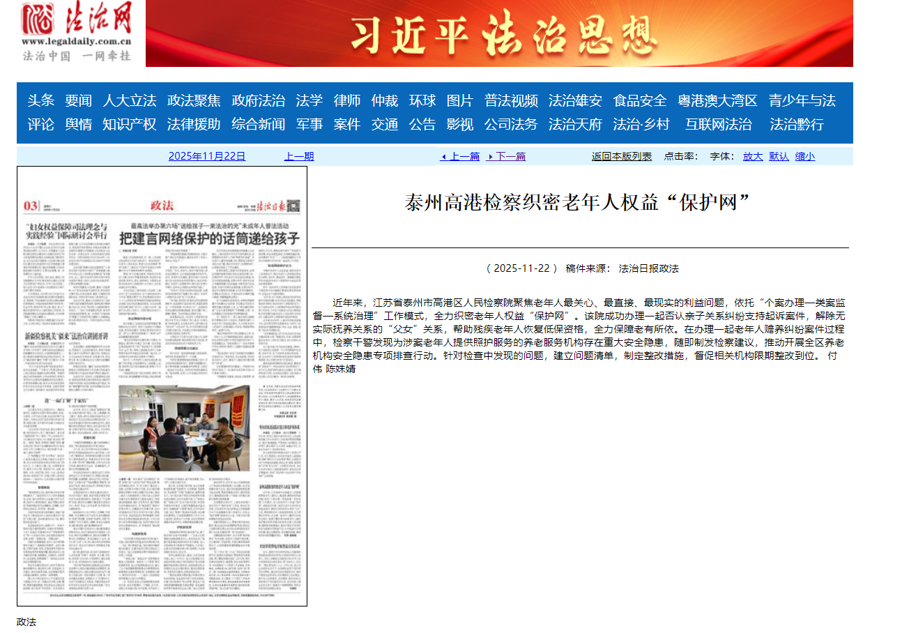 近年来,江苏省泰州市高港区人民检察院聚焦老年人最关心、最直接、最现实的利益问题,依托“个案办理—类案监督—系统治理”工作模式,全力织密老年人权益“保护网”。该院成功办理一起否认亲子关系纠纷支持起诉案件,解除无实际抚养关系的“父女”关系,帮助残疾老年人恢复低保资格,全力保障老有所依。在办理一起老年人赡养纠纷案件过程中,检察干警发现为涉案老年人提供照护服务的养老服务机构存在重大安全隐患,随即制发检察建议,推动开展全区养老机构安全隐患专项排查行动。针对检查中发现的问题,建立问题清单,制定整改措施,督促相关机构限期整改到位。